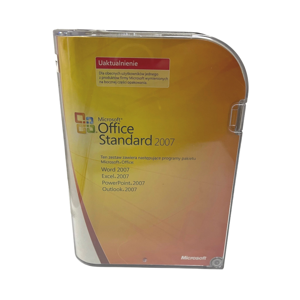 Pakiet biurowy Microsoft Office 2007 Standard w wersji uaktualnieniowej (upgrade) dla dwóch komputerów. Zawiera podstawowe aplikacje do edycji dokumentów, arkuszy kalkulacyjnych, prezentacji i zarządzania pocztą. Wersja BOX w języku polskim z fizycznym nośnikiem i kluczem produktu.