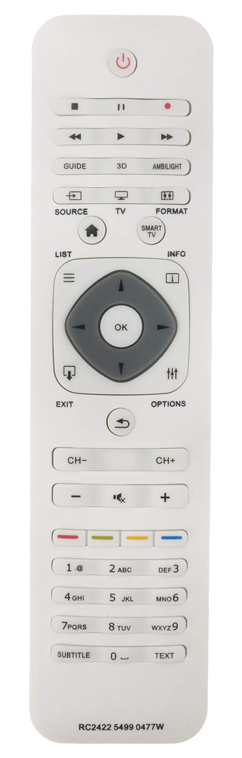 Zamiennik pilota do telewizorów Philips w białym kolorze, oznaczenie RC242254990477. Uniwersalny pilot gotowy do użycia zaraz po włożeniu baterii — nie wymaga żadnego programowania. Biała obudowa i czytelny układ przycisków zapewniają komfort obsługi podczas codziennego użytkowania.