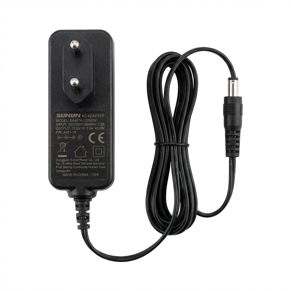 Zasilacz sieciowy AC/DC o mocy 42W z wyjściem 12V i prądem 3.5A. Uniwersalny zasilacz impulsowy z wtykiem EU i złączem barrel 5.5x2.1mm (center positive). Oryginalny produkt firmy Sunun (Dongguan Sunun Power Co., Ltd).