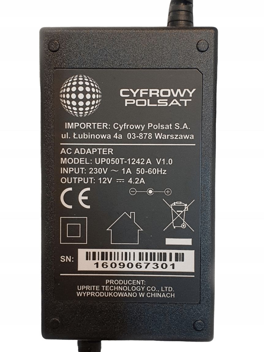 Oryginalny zasilacz UP050T-1242A do dekoderów Cyfrowy Polsat Evobox i nowszych modeli. Napięcie wyjściowe 12V, prąd 4.2A, wtyk 5.5mm/2.1mm. Nowy, z oficjalnej dystrybucji Cyfrowy Polsat. Zapewnia stabilne zasilanie niezbędne do prawidłowej pracy dekodera.