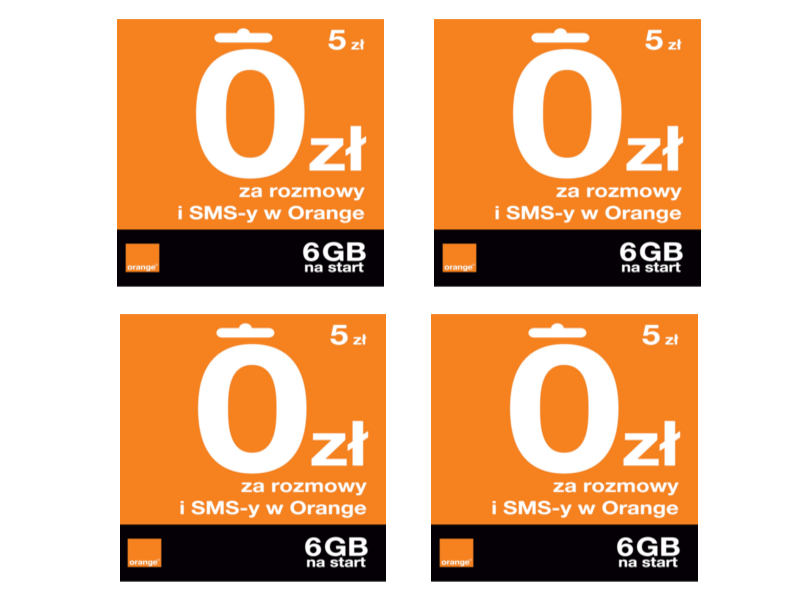 Zestaw czterech kart startowych sieci Orange Polska w pakiecie Yes. Każda karta posiada preaktywowane saldo 5 PLN. Idealne rozwiązanie dla osób potrzebujących wielu numerów lub do użytku w urządzeniach IoT, alarmach GSM, modemach.