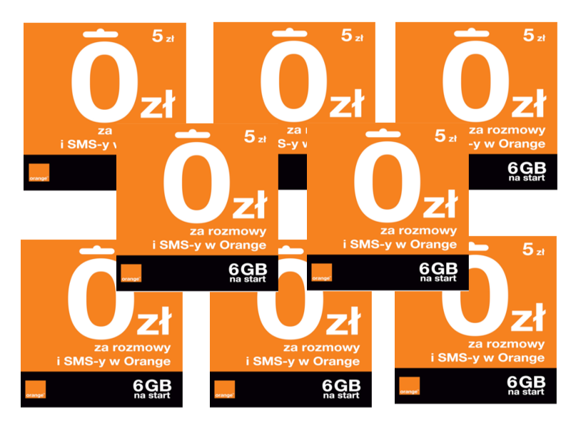 Zestaw ośmiu kart startowych sieci Orange Polska w pakiecie Yes. Każda karta posiada preaktywowane saldo 5 PLN. Ekonomiczne rozwiązanie dla firm, instalatorów alarmów, użytkowników wielu modemów LTE lub osób potrzebujących większej liczby numerów.
